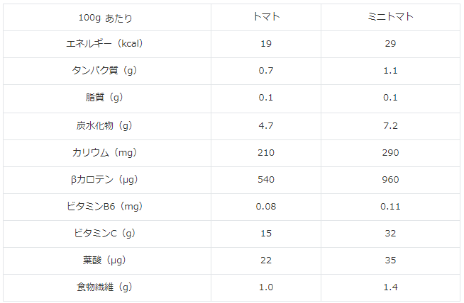 この表ではすべてミニトマトの方が栄養面で勝っています。